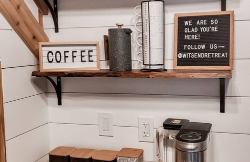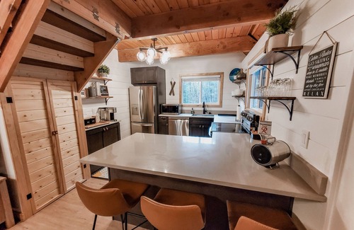 Wit's End Retreat was recently remodeled and offers a fully stocked kitchen with a full size range, refrigerator, dishwasher, and peninsula for eating. In the kitchen you will also find a coffee bar stocked with a Keurig, french press, coffee, tea, cider, and hot cocoa. The kitchen contains pots, pans, utensils, basic spices, olive oil, and balsamic vinegar for all your cooking needs. Just bring the food! There is even a bluetooth speaker if you need some music around the cabin.