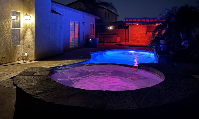 This house is awesome! Backyard has a grill to go along with pool and spa! Nice Grassy area with a tv for your viewing pleasure! complete kitchen with open floor plan connecting the family room! Big couch and tv for gathering. Huge dinner table! We do not allow parties. NO PARTIES!!!! please inquire about small gatherings, Dinners. please respect our neighbors. small gatherings will be an extra fee.