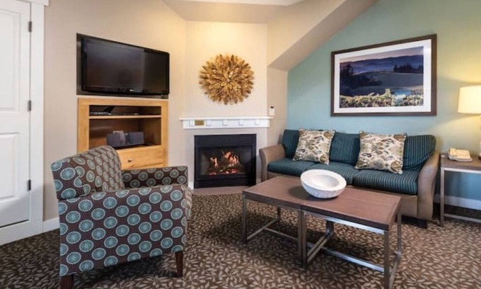 This spacious one-bedroom resort suite measures approximately 822 square feet. You will enjoy a king bed in the bedroom and one queen Murphy bed in the living room. Additional amenities include a full kitchen and dining area, gas fireplace, washer/dryer and a private terrace with gas barbecue. Maximum occupancy is four. Private sleeping area sleeps two.