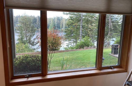 The unit has an unobstructed view of woahink lake. Nestled in the woods the view is the main attraction. We have a trail that leads down a gentle slope to a dock and boathouse with a firepit to keep you comfortable. You may use the dock and paddleboard at your own risk!