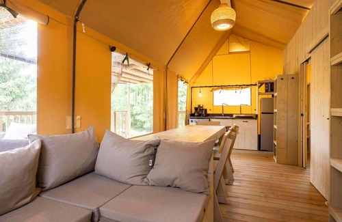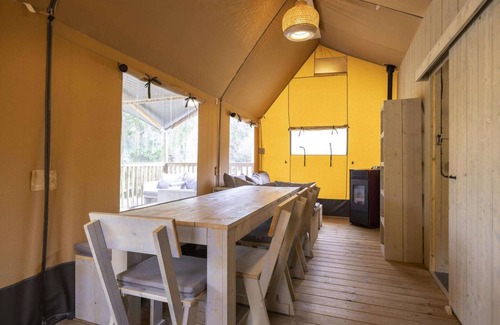 Escape to a spacious, fully-equipped glamping tent located in the serene Ardennes region. Ideal for families or groups, this modern tent offers a cozy retreat surrounded by nature. With three bedrooms, including a master bedroom with a double bed and two additional rooms with single beds and bunk beds, it can accommodate up to 8 people. This tent is perfect for a peaceful getaway while enjoying the comforts of home in the heart of a family-friendly campsite. Nestled in the Grand Est, the surrounding area offers plenty of activities to enjoy all year round. Take advantage of the walking and cycling trails that weave through forests and fields. In summer, enjoy the refreshing outdoor swimming pool, while autumn brings the excitement of mushroom hunting. The nearby tree top park and fitness trail provide added adventure. The site also features a restaurant, reception, small shop, and endless natural beauty, making it a perfect base for exploring the Ardennes. The glamping tent includes modern amenities such as a kitchenette with a fridge, microwave, coffee machine, and electric cooker. A pellet stove ensures warmth during cooler days, while garden furniture with a parasol invites relaxation outdoors. Additional features include Wi-Fi, a shower with washbasin, and free parking for one car. Pets are welcome, making it a great option for pet owners.