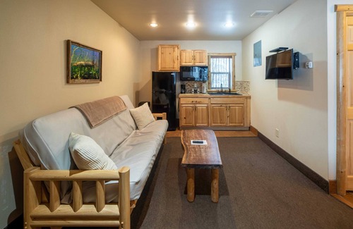 Wolf Lodge is one of 9 at The Totem Lodges in Indian River, Michigan. Wolf Lodge is a Suite that includes a living/dining room, with gas fireplace, a separate bedroom with a Queen Bed complete with bed linens and extra sheets and pillows in closet for futon that sleeps 2 and bathroom with a large tiled shower. Towels and bathroom linens are provided. A blow dryer is provided for use. Each Suite has a refrigerator, microwave, and coffee maker with complimentary coffee, creamer and sugar. Coffee cups, plates, bowls, and silverware are available. Free vehicle parking with room for limited Snowmobile/AV Trailers and Boats. Laundry Facility is on-site and available for guest use at no cost after 4:00 pm Hi-speed Wi-Fi is included. We would love to have you stay and play in beautiful Northern Michigan.