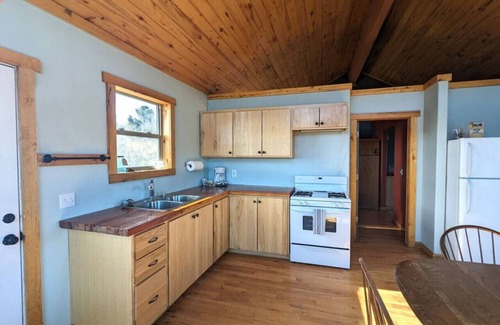 This charming one bedroom, one bathroom private mini cabin boasts a full kitchen and dining area along with a view that overlooks a grove of large pines and stunning sunrises. Includes a full size pull out bed and bedding. Grab a good book and a warm drink and settle in by the wood burning stove, or on your private deck.