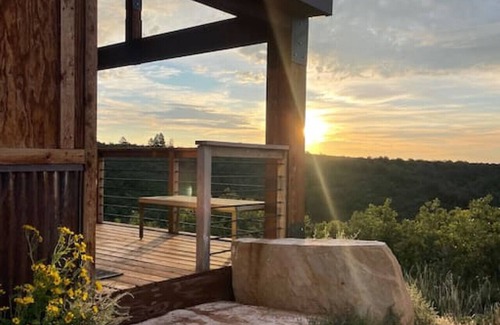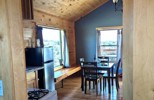 This charming one bedroom, one bathroom private mini cabin boasts a full kitchen and dining area along with a view that overlooks a grove of large pines and stunning sunrises. Includes a full size pull out bed and bedding. Enjoy a meal or a quiet afternoon on your own private deck.