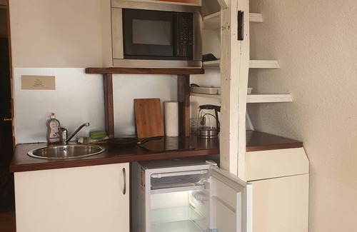 The apartment has 1 room and is furnished with 2 comfortable single beds, chest of drawers, bedside table, chairs and table, W-Lan and TV.