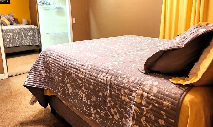 Your bedroom is a tranquil sanctuary featuring a plush queen-sized bed that promises restful nights. You'll have ample storage space for your belongings with a regular closet, dresser, and nightstand. Carefully chosen black-out curtains ensure you can sleep in undisturbed darkness or enjoy a peaceful afternoon nap in complete privacy.