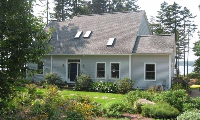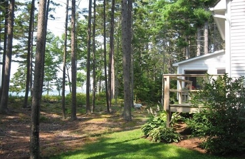 Waterviews from almost every room! Located on the water's edge, this property surrounded by tall pines is on 3 acres. A screened- in porch lends itself to eating while watching stupendous sunsets. The accessibilty to the community dock is right off our property and allows for boating and kayak launching. A mooring is a possibilty for rent. The first floor has an open concept where the kitchen and living area are not separated. It also has a master bedroom with a queen and a full bathroom with a claw foot bathtub. The den with TV and sleeper sofa, foyer/ dining room and mud room finish off the ground floor. The 2nd floor has 2 bedrooms, one which is also a master with queen and one with twin beds. A bathroom and sitting area with Futon can also be found on this level.
