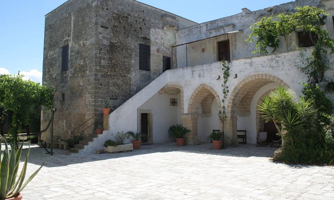 Estate of the 14th century surrounded by a high stonewall with chapel, pergola, olive- orange-lemon and figtrees, pomegranates ... in the heart of the mythical Negroamaro. Passing two gates you are reaching a large scale courtyard with historical buildings and wonderful gardens.