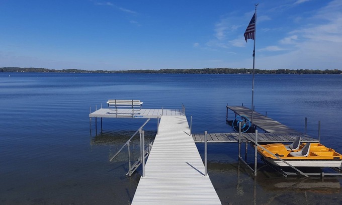 Large living room with beautiful views of Rock Lake. King size bed in the primary bedroom, queen size beds in bedrooms 2 and 3, three sets of bunk beds in the 4th bedroom bunk room to accommodate up to 6 children, and a full futon in the rec room. We do not store things in the dressers and closets so there is plenty of room for your things. You do not have to live out of your suitcase! A spacious kitchen offers sit down dining for the whole crew. We have a large pantry and cupboards that are available so you can stock up on groceries to minimize your trips to the store and maximize your time at the lake! Propane and charcoal grills are located right outside the dining room. The rec room provides plenty of additional space and a game room off of the garage has an air hockey table. We also have 2 kayaks, a pedal boat and life jackets for use while using them. Whether you're looking for a change of scenery, to relax in a quiet peaceful setting or you are excited to fill your days with swimming, fishing, kayaking, boating and local activities, our home is a great backdrop for your family vacation on Rock Lake. Bring your own boat or rent one and dock it on our pier (the pier is in from mid-May until the first weekend in October) . We are situated on a dead-end road on the southern shore of the lake and have parking for 4 vehicles and a boat trailer. The location offers beautiful views, a sandy bottom for swimming, and is ideal for fishing, kayaking, or boating from our private pier. This affordable vacation destination is a wonderful place to make memories and get away from it all.