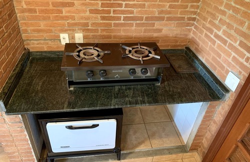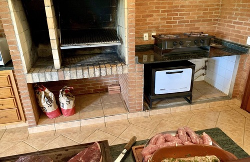 Gourmet space is enclosed with glass doors, with Parrilla Argentina, industrial oven p pizzas and roasts (Leitoa, meats, pasta, etc.), industrial stove, refrigerator, toilet, 2 large tables that accommodate 18 people, plates, cutlery and Separate barbeque utensils from the dining room.