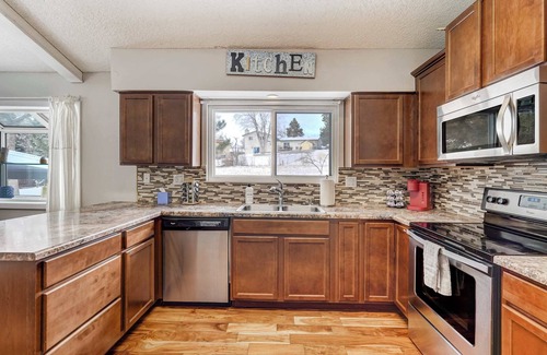 Step outside to the expansive backyard, where a covered patio with seating creates a peaceful retreat. Unwind in the private hot tub, fire up the charcoal BBQ grill, or sip your morning coffee while taking in the fresh Colorado air—this outdoor space is perfect for relaxation and connection.