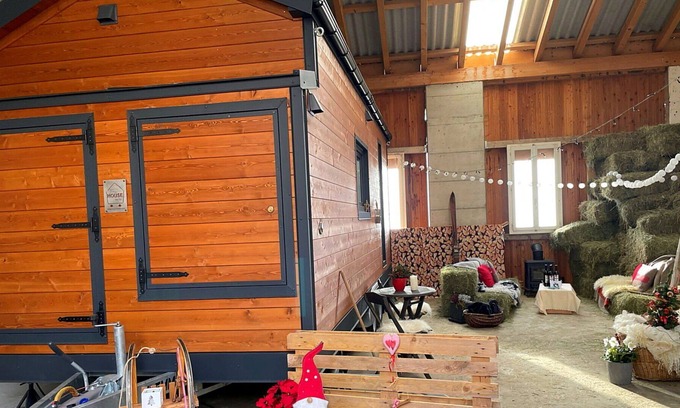 Erschwil 9 km from Leuk Stadt: Modern, cosy, comfortable mobile home "Schlaf beim Schaf", 1'250 m a.s.l built in 2022, surrounded by meadows. On the outskirts, in a secluded, quiet, sunny position on a slope. Private: natural state property. Patio. Breakfast possible on request. Pre-arrival grocery service. Narrow motor access (mountain road). Parking. Grocery 550 m, restaurant 650 m, bus stop 600 m, railway station "Leuk" 7 km, thermal baths "Leukerbad" 18 km. Golf course (18 hole) 13 km, walking paths from the house 1 m, skisport facilities 12 km. Nearby attractions: Roggen-Zentrum Erschmatt, Stockalperschloss Brig. Well-known ski regions can easily be reached: Zermatt, Saas Fee. Hiking paths: Leuker Sonnenberge, Leukerbad - Torrent. Please note: car recommended. On the estate animal husbandry. Local sale of farm products. The Tiny House is located in the pasture, surrounded by sheep, chickens, horse and pony.