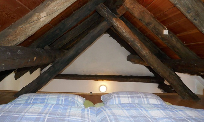 You will be staying in a 1-room cottage with sloping ceilings, simple and practical furnishings. The open living/sleeping room contains a sofabed (160 cm, length 200 cm), a dining table, a radio, and a wood-burning stove. The kitchenette is equipped with a Gas stove. The cottage also has a shower/WC. On the upper floor, accessible by a ladder, there is a mezzanine with 2 beds (80 cm, length 200 cm). The cottage features a terrace with furniture.