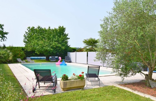 "L'Ostalet de Sarron" is a beautiful country house located in Brax, France. It offers a private swimming pool with an internal staircase and alarm system, a pergola, terrace, garden furniture, and parking for two cars on the premises. The property also features a yard, internet WiFi, and is within proximity to shops, supermarkets, restaurants, and bakeries.
