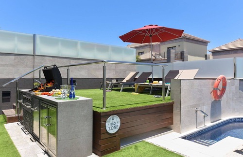 Modern, luxurious single-family house "Meloneras Hills 19" in Meloneras, Maspalomas, Spain, offers a prime location with a central yet quiet setting in a residential district. This holiday rental boasts a private fenced garden, a seasonal swimming pool (4 x 2 m, depth ranging from 1 to 60 cm), an outdoor shower, and parking on-site. It provides convenient amenities such as Internet WiFi, a yard, a tennis court, and a swimming pool for your enjoyment.