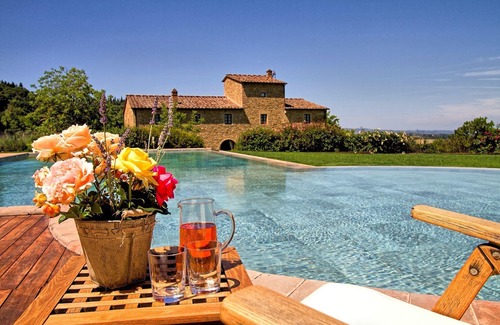 Beautiful private villa with swimming-pool situated in panoramic location on the Tuscan hills, between Florence and Siena. This splendid property has been recently restored preserving its original architectural features and has been turned into an elegant villa sleeping up to 16 people and an adjoining outbuilding for 8 people (rentable upon request only together with the main villa) allowing a total number of 24 guests. Both the villa and the outbuilding are tastefully furnished and offer spacious and extremely comfortable interiors.