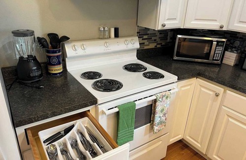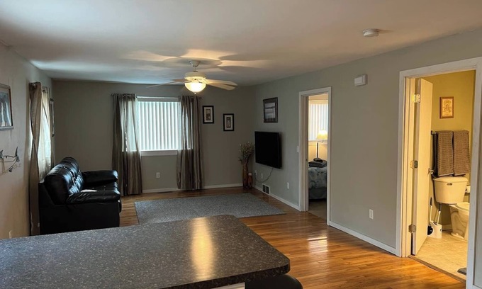 Property is located right off of the main road but set far back enough that road noise is not an issue. Large front yard with a fenced in area in the back so your pets can have a safe area to play in. Parking is available in both the front and rear. Rear parking can be accessed from the alley. Kitchen and living room form one large space in the front of this home. Both bedrooms are located off of this main area. In one room we have a queen size bed, the other we have two double beds and in the living room the couch can be made into a full size bed. Internet and Hulu TV provided for you.