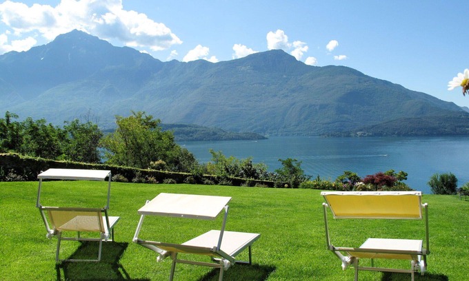 This semi-detached house offers a marvellous panoramic view of the lake, the mountains, and Monte Legnone (2609m). The upper floor consists of two bedrooms: one with a dressing room, a French bed (160 cm), satellite TV, and air conditioning, while the other room has two beds, satellite TV, and air conditioning. There is also a bathroom with a hydro massage bathtub. Additional facilities include a washing machine, iron, children's high chair, and baby cot. Complimentary Wi-Fi internet access is provided, and there is reserved parking for one car located 300 meters away. Please note that the maximum capacity is four guests, with two bedrooms and two bathrooms.