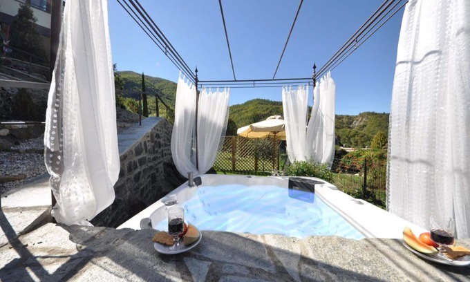 Outdoor heated hydromassage bath, 4 seats or 2 comfortable loungers, fenced-in equipped garden, equipped outdoor courtyard, BBQ, sunbeds , washing machine, iron and ironing board,autonomous heating, hairdryer, baby cot available on request.