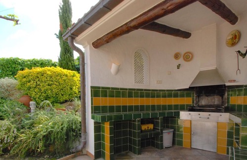 The house is surrounded by a nice sunny garden with lots of privacy, Mediterranean vegetation, a large barbecue area designed for large family meals and porch area. By the exit of the kitchen we reached an outdoor area with table and awning with the rear view of the garden.