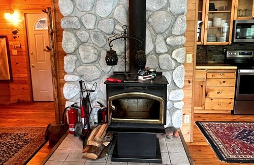Enchanting three story chalet style home with a wood stove, beautiful pine wood walls and ceilings, three bedrooms with a fourth bedroom bunkhouse attached to the home . We have recently added a sleeping cabin that looks like it is out of a storybook. It sleeps 2-3 people and makes a great fifth bedroom option. There are three bathrooms, playroom with foosball, ping pong, games and movies, 2nd TV. There is a fold out couch for extra friends plus an Aero bed for extra, extra friends. Enjoy the fun cabin/lodge furnishings.