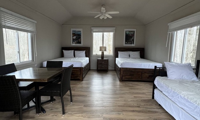 The cabin features two Queen size beds and a convenient trundle bed, comfortably accommodating up to six guests. This cabin offers a mini fridge and a microwave for easy convenient meals. Air-conditioning and grills are also available upon request. While there are no bathrooms or sinks inside the cabin, you'll find clean and well-maintained facilities just a short stroll away in the main lodge. The lodge is equipped with showers, bathrooms, and a commercial kitchen, ensuring all your needs are met.