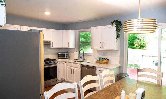 Your assistance in maintaining our space's cleanliness and warmth is deeply appreciated. If you find the trash can in the kitchen full during your stay, we kindly request that you gather your trash and place it in one of the bins conveniently located on the driveway.