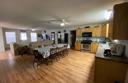 Our spacious lake house has 7 bedrooms and 3 full baths. The large kitchen is fully equipped and has a refrigerator, gas stove/oven, microwave, ice machine and coffee bar. The open living area has a dining table that seats 8 with 2 extra chairs. The living room has a large TV with a DVD player, an antenna for local TV stations and a Fire stick for streaming and Starlink WIFI.