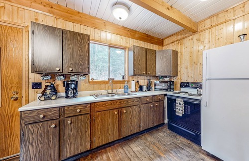 Whether you spend your days hiking, fishing, or swimming, you'll delight in coming home to a cabin where wood-paneled walls, beamed ceilings, and an impressive stone hearth only enhance the mountain atmosphere. The living spaces are all open to each other - the well-equipped kitchen, the dining area, and the living room with its smart TV and wood-burning fireplace.