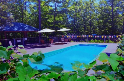 Wooded Lake cottage, fire ring, charcoal grill, picnic table, back deck of the cabin, swimming pool, hiking trail, & playground. (Swimming Pool is open from Memorial Day weekend - Labor Day)