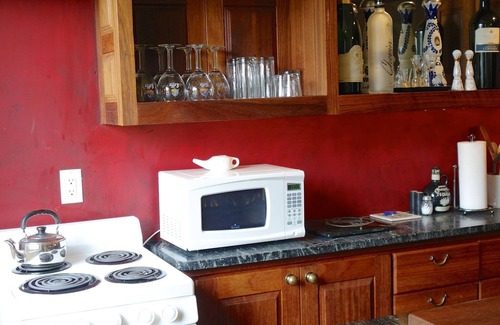 Downstairs, there is a Bar styled room which contains a small kitchen. The Bar features cherry wood, antique light fixtures and has seating for 4.. A small dining table offers seating for 2. Light meals can be prepared using the stove, oven or microwave. 2 small refrigerator/freezer combos and a dishwasher finish the cozy, stylish and adequate kitchen.
