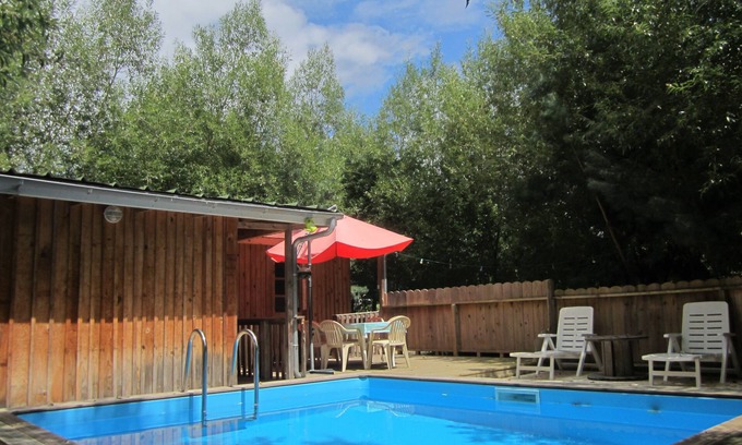 Wooden lodge with terrace and swimming pool in a green setting is located in Fosses-et-Baleyssac. Wooden lodge with terrace and swimming pool in a green setting provides accommodation, featuring Pool, Designated Smoking Area, Balcony/Terrace, among other amenities. This Cabin features Pool, Designated Smoking Area, Balcony/Terrace, to make your stay a comfortable one.