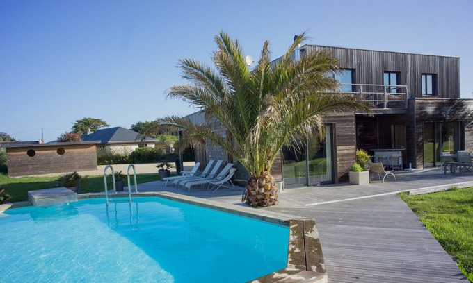 Contemporary wooden house with private heated pool (June to September). This villa has a large wooden terrace of 150m2 around the pool and the house. Large windows open onto the landscaped garden of 3000 m².