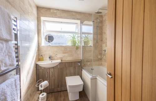 - Family bathroom with large bath with overhead handheld shower, wash basin and WC.