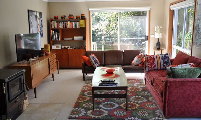 Our home is set in two acres of established trees and gardens overlooking a pond resplendent with water lilies and abundant bird life. The retro styled private apartment has one bedroom, bathroom, full kitchen, living, dining with private entrance and off street parking.