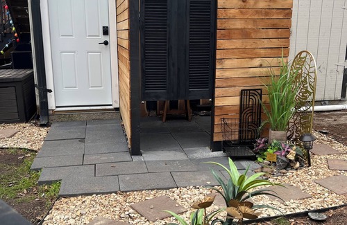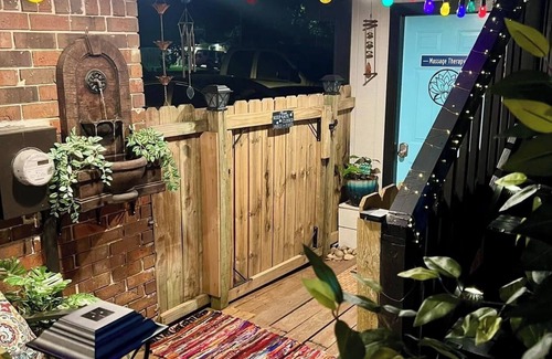Located approx 1mile from I45 in the woodlands. Upstairs garage apartment/guest house furnished with 1 King bed for 2 guests, (queen air mattress avail if needed), work desk and chair, tv, refrigerator, microwave, toaster, electric skillet, crock pot, coffee/wine station, keyless entry. No stove/oven. Outdoor grill. Balcony. Propane firepit. Small workout space inside with dumbbells and yoga mats. Driveway security. Spa on property available for additional costs w/ licensed massage therapist. (Additional fees apply for sauna, hot tub, pool & oudoor shower usage and is NOT included in daily VRBO rate.)