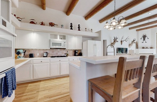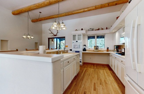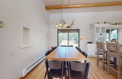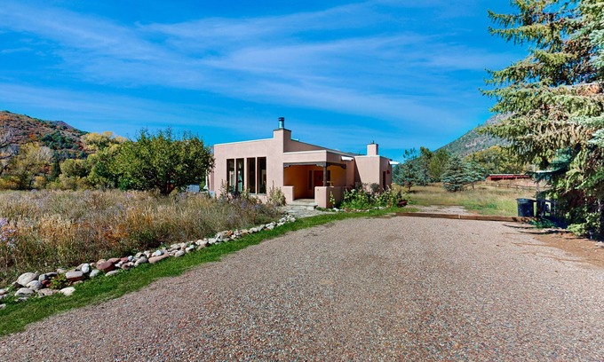 Located in rural Woody Creek, just a short 15-minute drive from Aspen, Snowmass Village, and Basalt, this adobe-style house on two acres offers a unique and cozy retreat for your mountain getaway. Built by the family with an open layout and high ceilings, this home exudes warmth and charm, perfect for a family vacation or a group of friends looking to explore the great outdoors.