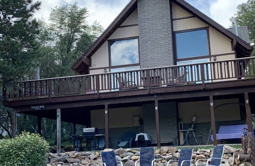 This 1500 sq ft fully furnished Two bedroom ( each has a queen size bed) with fully stocked kitchen, family room (has a queen bed/ futon couch), bathroom are in the downstairs of this large A-Frame house in the woods. Only 6 miles (12 min) from the Courthouse on Whiskey Row which is the center of town in Prescott. The downstairs has a separate entrance with everything you need to host a group of 7 people. The decor is all actual artifacts and artwork from Africa, Peru and Australia. This house is extremely clean, quiet, very comfortable with amazing views. The owner lives in the house above