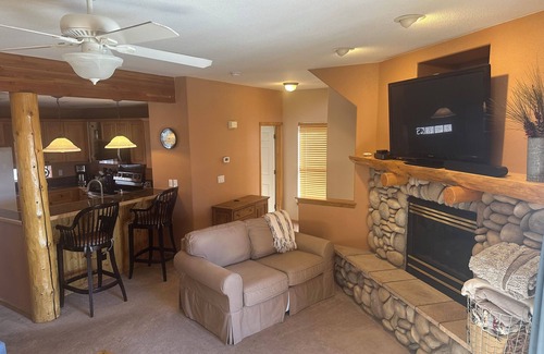 Spacious living area with open kitchen, great for hanging out after a day on the lake, trails, or slopes.