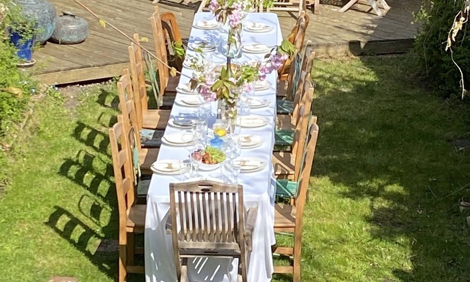 You can comfortably sit 10 people at the dinner table with a further 10 people seated on the decking. For those wanting a continuous long table, it's possible to bring the kitchen table to the decking in summer time - or we can configure the double reception room to fit a long table - this needs to be requested in advance....