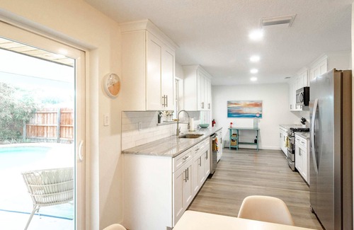 The kitchen is both beautiful and functional. Newly updated, it offers everything the family chef needs and more, with view of the pool. And who could resist that large window overlooking the backyard? Whether you're whipping up a gourmet meal or just heating up some leftovers, this kitchen is sure to please.The adjacent dining table for 6, overlooking the pool deck, makes serving and clean-up a breeze.