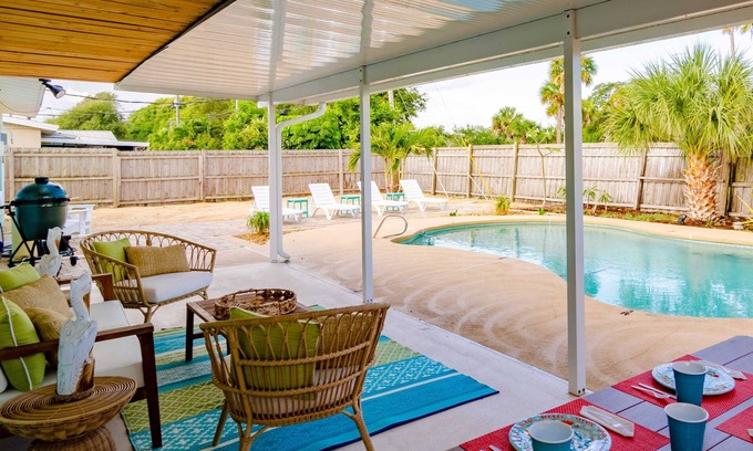 Our outdoor oasis is the antidote to the hustle and bustle of everyday life! The large in-ground pool (complete with pool gear) is perfect for a refreshing dip, while coquina rock brings the feel of the beach to your private poolside. The tall privacy fence ensures that you can enjoy your own little slice of paradise without worry, and the row of sun chairs is the perfect spot to soak up the Florida sun. Fire up the Big Green Egg for a barbecue and then enjoy the fruits of your labor at our al fresco dining table. The covered seating area is perfect for getting out of the sun with your book or mobile device. Going to the beach? We’re happy to provide bikes and beach gear.