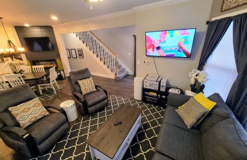 We renovated this space with your entertainment in mind. The living room opens up into the dining room and kitchen. This allows groups to have the space they desire while ensuring no one misses any of the fun. The living room has a 55" tv with Roku a couch and (2) chairs.