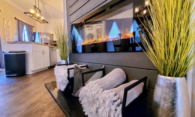 The dining room has a 60" wide fireplace, 55" tv, dining table and seating for 7.