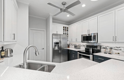 To the left of the living room, you will find the fully appointed kitchen with Cambria Quartz Counter tops, Stainless Steel Refrigerator, Dishwasher, Microwave, and Stove. The beautiful shaker white cabinets hold all you need should you decide to make a quick snack or a gourmet dinner. All high end flatware, dishes, glassware, utensils, A full All-Clad pot and pan cookware set, serving bowls, and much more! For breakfast, there is a professional bagel and bread toaster, coffee machine, Kurig, and Breville electric kettle for coffee or tea.