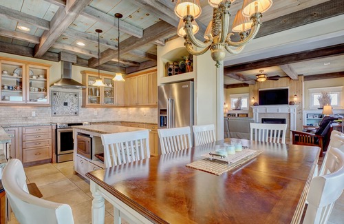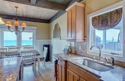 With granite counter-tops, stainless steel appliances and beautiful cabinetry, the kitchen is a welcoming place to prepare tasty family meals. All of the dishes and cooking utensils necessary for preparing that perfect meal is provided for you. NO detail has been left out in this dream kitchen! The dining area (seats 8) and offers SPECTACULAR ocean views! An additional 3 seat bar stool table is only steps away from the dining table.