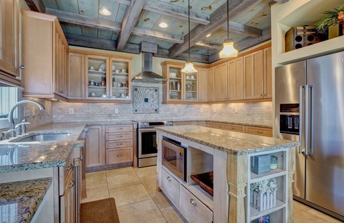 The living room has a comfortable leather sectional with built-in recliners. In addition, two separate recliners provide ample space for all to enjoy. A 55" flat screen TV with surround sound, HD DVR and Blu-Ray DVD player is flanked by built-in bookcases that house a children's movie library and books for the grown-ups. A gas fireplace completes the comfort of this room.