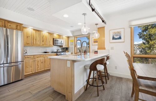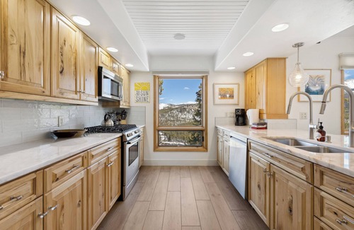 Open layout with large living/dining area. Newly remodeled, this home is nicely appointed and thoughtfully decorated. The floor plan offers plenty of privacy with bedrooms spread out over four levels. The main living area on the second level includes a wood-burning fireplace, TV, ample seating for a large group, and access to the hot tub on the front deck. There are three balconies in total. The kitchen has stunning views and is equipped with high-end appliances and all the kitchenware needed for your stay. You can serve eight guests at the kitchen dining table overlooking the town and six at the front table overlooking the ski runs. This home also includes a full-size washer/dryer, free Wifi, a heated 2-car garage with room for gear, and space for 2 more cars outside the garage (max of four vehicles).