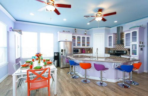 This impressive 3,500 sq.ft. house features two spacious living rooms, each measuring 20 x 40 ft., along with two open-concept kitchens equipped with modern amenities. Accommodating up to 40 guests, you'll find six beautifully designed bedrooms with custom-built XL bunk beds, ideal for both adults and children. The thoughtful nautical decor invites a coastal vibe, while the wrap-around balconies offer remarkable views of the Gulf of Mexico. Experience luxury in every detail, from the vessel sinks in the four bathrooms to the top-of-the-line washer and dryer, ensuring all your needs are met during your stay. You can even rent golf carts at discounted rates for added convenience!