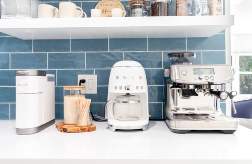 Cook your favorite meals in a fully equipped kitchen with stainless steel appliances, including a fridge, oven, and microwave. Enjoy a coffee station with free coffee and a custom wine cooler to keep your drinks chilled. Dine in style at a spacious table with seating for six, perfect for special meals.